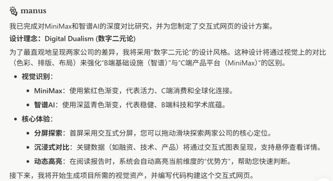 随后我登录了Manus网站,想试用看看,我给它设立了一个比较简单的任务:Minimax和智谱这两家AI公司有什么区别?各有什么优势?