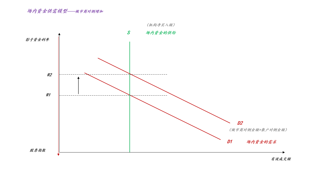 相反,如果做市商增加对倒操作,让场内资金的需求曲线D从D1扩张到D2,情况将变得很不一样,影子资金会从R1小幅回落至R2,相应的,股指会从g(R1)温和上涨至g(R2)。