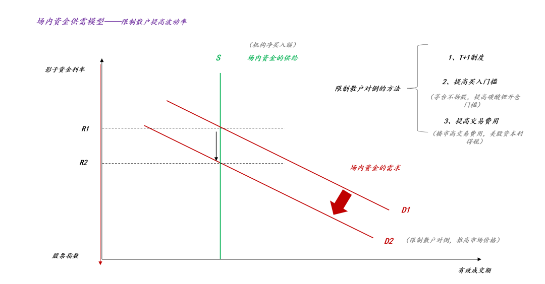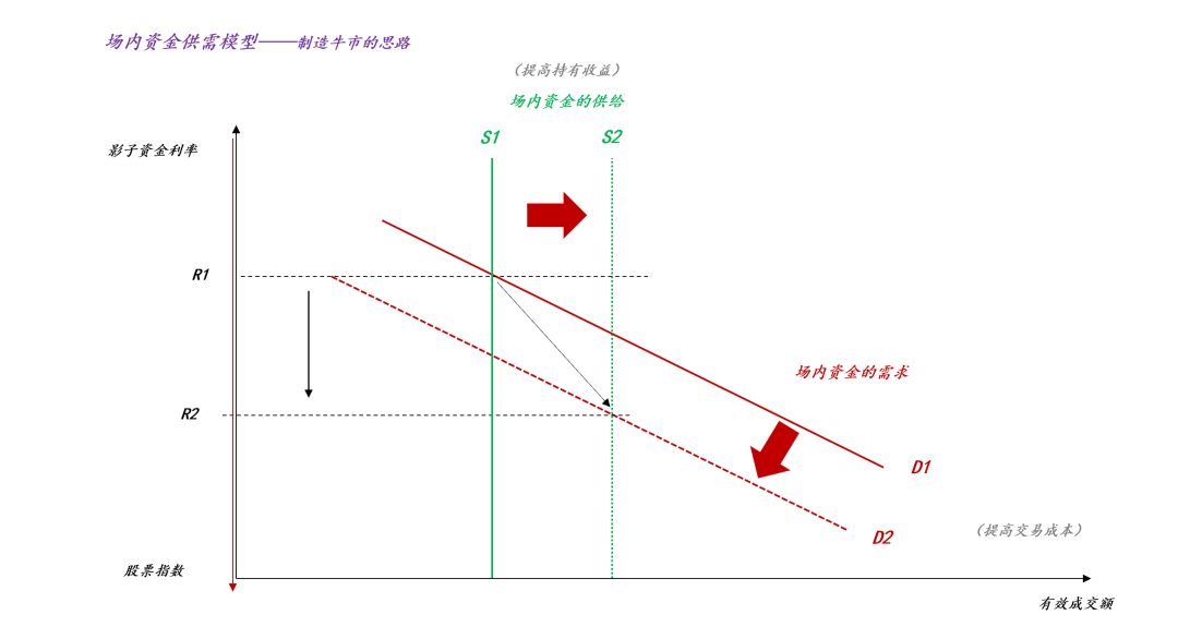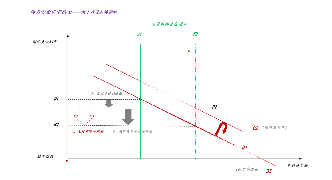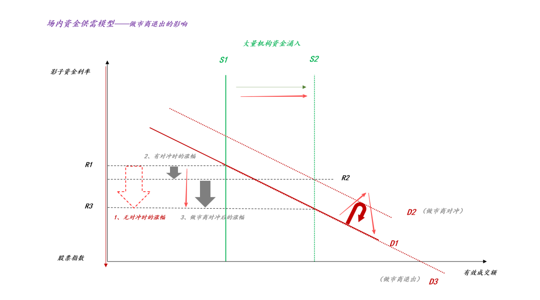 如上图所示,外生冲击导致大量机构资金涌入(ps:既包括交易资金,也包括配置资金),于是,场内资金的供给曲线S从S1扩张至S2,如果做市商不做任何操作的话,那么,影子资金利率会从R1跳水至R3,相应的,股指会从g(R1)大涨至g(R3)。