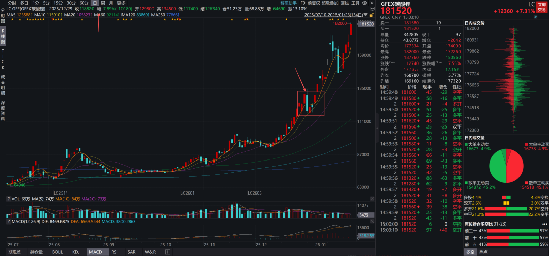 如果我们掌握不了做市商模型,那么,我们实际上无法区分哪些制度服务于“融资市”,哪些制度服务于“投资市”。譬如,“T+1”制度是融资市的台柱子。如果我们不了解做市商模型,我们没办法把“T+1”制度和融资市联系在一起。一旦我们掌握了做市商模型,一切都变得简单明了了:如上图所示,T+1制度的本质是限制散户的对倒能力,即散户当天买入了无法卖出。这会导致场内资金的需求曲线D系统性地从D1收缩至D2,于是,影子资金利率从R1降低至R2,相应的,股指会系统性地从g(R1)上涨至g(R2)。也就是说,T+1制度可以有效地放大系统的波动率,从而,推高股票的估值。这一点对新股票的发行极其重要。另一个跟“T+1制度”类似的制度是“提高散户参与门槛”,譬如,贵州茅台属于高价股,一手的参与门槛是十几万。为了挽救茅台低迷的股价,不少投资者会凭着直觉给上市公司出主意——“拆细股价”。事实上,根据做市商模型,这是典型的“好心办坏事”。所以,每一次上市公司都以各种理由拒绝。近期,还有一个案例是,广期所提高了碳酸锂的开仓门槛,从1手提高到5手:广期所12月24日发布通知,决定自2025年12月26日交易时起,碳酸锂期货LC2601、LC2602、LC2603、LC2604、LC2605、LC2606、LC2607、LC2608、LC2609、LC2610、LC2611、LC2612合约的交易指令每次最小下单数量中的每次最小开仓下单数量由1手调整为5手、每次最小平仓下单数量维持1手。如上图所示,2025年12月26日新规则落地之后,碳酸锂指数宽幅震荡,清理掉大量的散户敞口。之后碳酸锂期货波动率显著放大,快速拉升。通过做市商模型以及上文的几个具体案例,我们知道:如果你想要提高一个标的的估值,那么,你就要推高他的波动率。其中,最有效的办法是:1、设置较高的参与门槛;2、给交易设置较高的交易门槛。其中,最反直觉的案例是,提高印花税助推股票牛市。