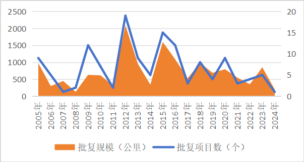 图 1 2005-2024年各城市轨道交通规划建设获批情况