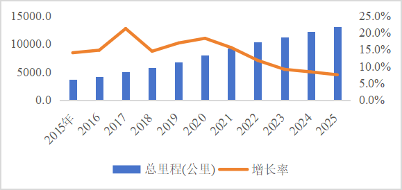 截至2025年底,共计58个城市开通城市轨道交通运营线路382条,运营里程达13071.58公里。数据显示,2015-2025年,运营里程呈持续增长态势,2015-2024年复合增长率为13.7%。但自2021年起,增长率呈持续下降趋势,城市轨道交通正从快速发展阶段迈向高质量、可持续的平稳发展阶段。由于批复及建设周期性因素,预计“十五五”末期,运营线路增长趋势将断崖式下降。