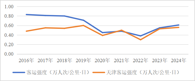 2024年,全国城市轨道交通平均客运强度为0.61万人次/公里·日,较2019年下降14%,较2015年下降27%,2016-2024年,客流强度总体上呈下降态势。随着已批复存量规划项目的建设推进,结合各地经济发展状况,预计在“十五五”期间,整体客运强度仍将在达标线附近波动,超过半数城市的客流强度仍无法达到标准。