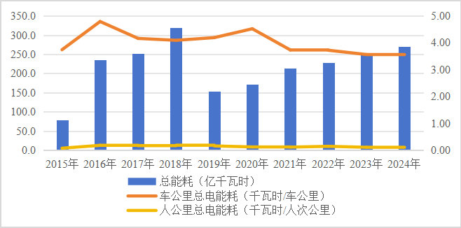 2024年,全国城市轨道交通总电能耗270.23亿千瓦时,同比增长6.83%。其中,牵引能耗141.50亿千瓦时,同比增长8.26%。牵引能耗占总电能耗的比为52.36%。随着新投运线路的不断增加,总体能耗指标不断增长,总电能耗和牵引能耗均达历史最高。2024年,城市轨道交通平均每车公里总电能耗3.54千瓦时,同比下降0.42%。平均每车公里牵引能耗1.86千瓦时,同比增长0.91%。2024年,城市轨道交通平均每人次公里总电能耗0.102千瓦时,同比下降1.34%。平均每人次公里牵引能耗0.05千瓦时,同比下降0.01%。