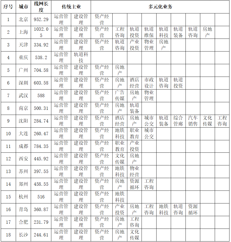 在资源禀赋、财务压力等因素影响下,城市轨道集团往往在成立之初,就开始了多元化的探索。拥有200公里运营里程的城市轨道集团公司的业务布局如下表所示: