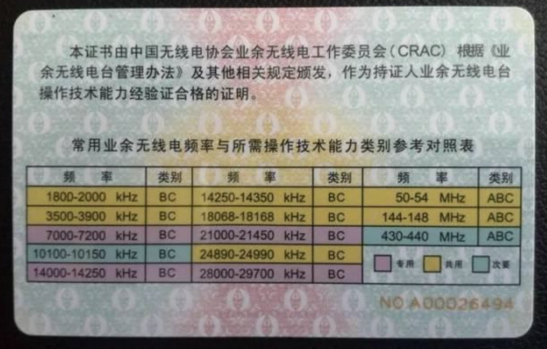去年,证书有一些变动,由原中国无线电运动协会(CRSA)颁发的纸质操作证书停止使用,需换发为中国无线电协会业余无线电分会(CRAC)对应的A、B、C类证书(A类对应UV频段,B类和C类对应短波段发射功率最高1000瓦),其中原1级对应C类,2级和3级对应B类,4级对应A类。