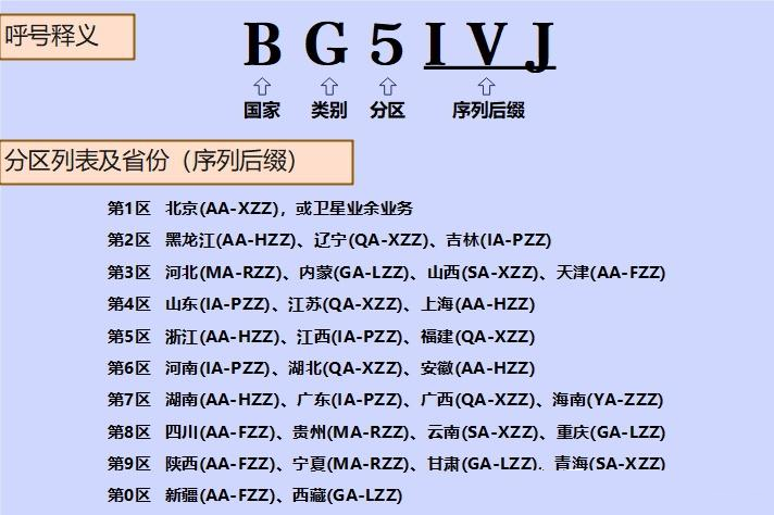 以BG1BLU为例,首字母B是中国地区的代码,后面的G是操作等级的代码(G为3~5级,D为2级,A为1级),数字1代表北京地区(全国划分为1~9区),后三位英文字母是排序生成的爱好者代码。