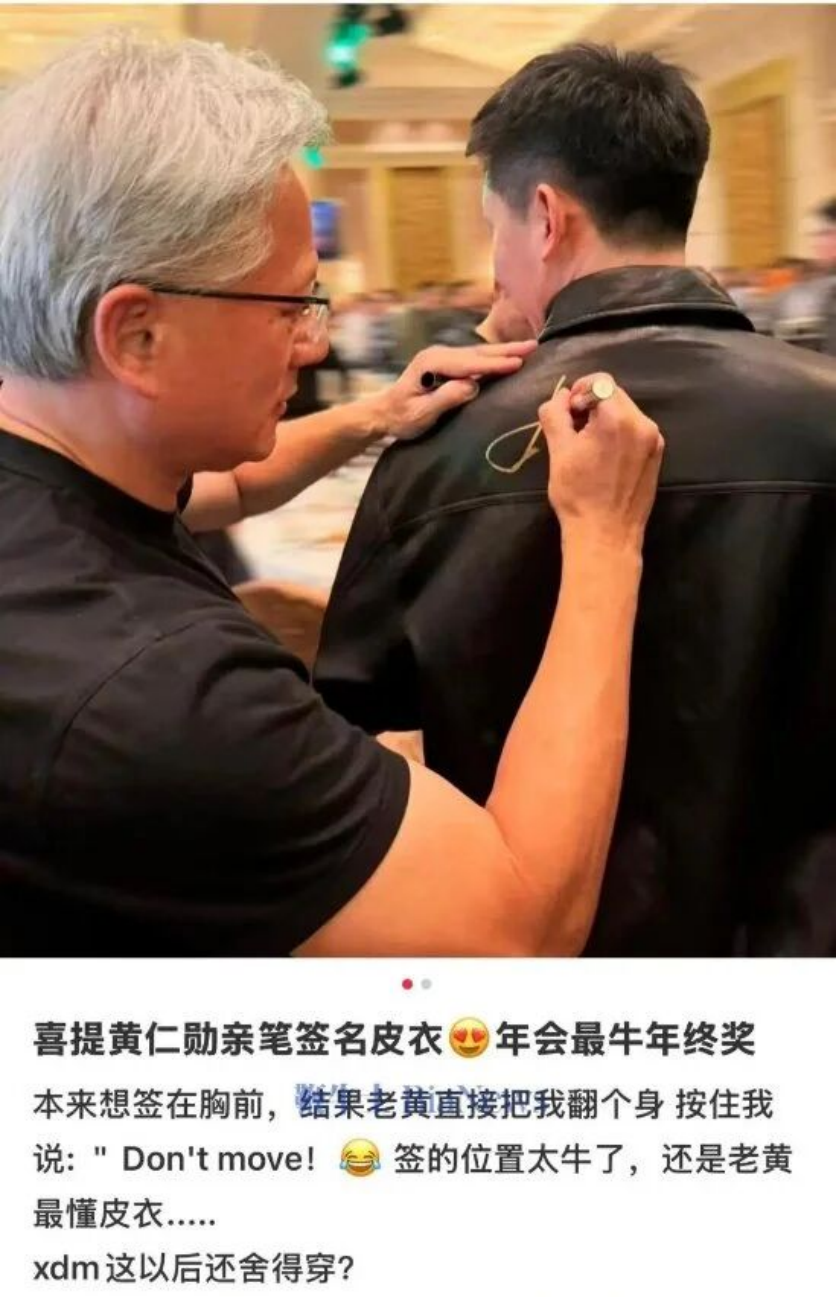 据观察者网,近日,英伟达CEO黄仁勋陆续到访上海、北京、深圳,分别参加了三地分公司举办的新年活动。1月27日,有网友在社交媒体晒出一件黄仁勋亲笔签名的皮衣。该网友表示,自己本来想签在胸前,结果黄仁勋直接把他翻个身按住并称“Don"t move!”
