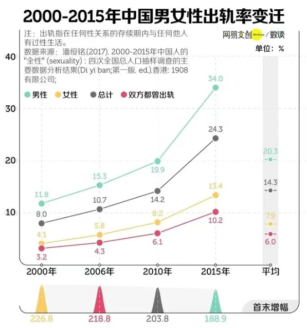 到了2015年,平均出轨率飙升到24.3%,出轨率增幅达212.5%。