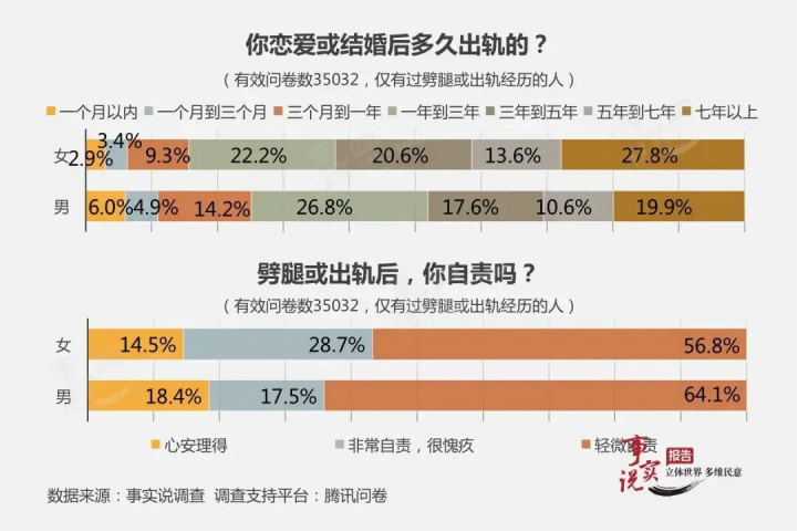 3年以内的亲密关系,男性的出轨率大于女性;5年以上的亲密关系,女性的出轨率则高于男性。