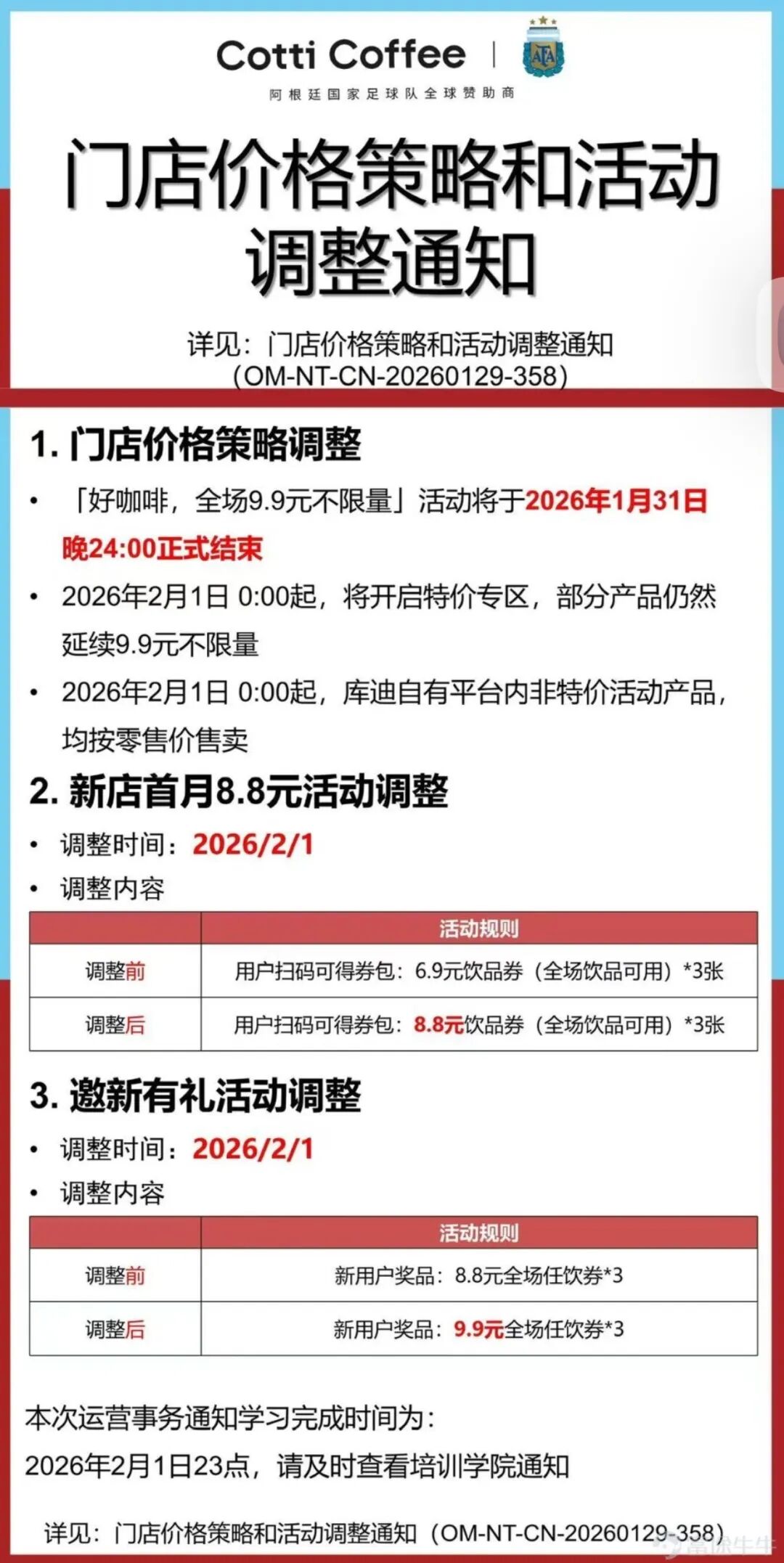 三是新店首月用户扫码得6.9元饮品券活动,调整为8.8元饮品券;拉新活动的“8.8元任饮券”也同步调整为“9.9元”。