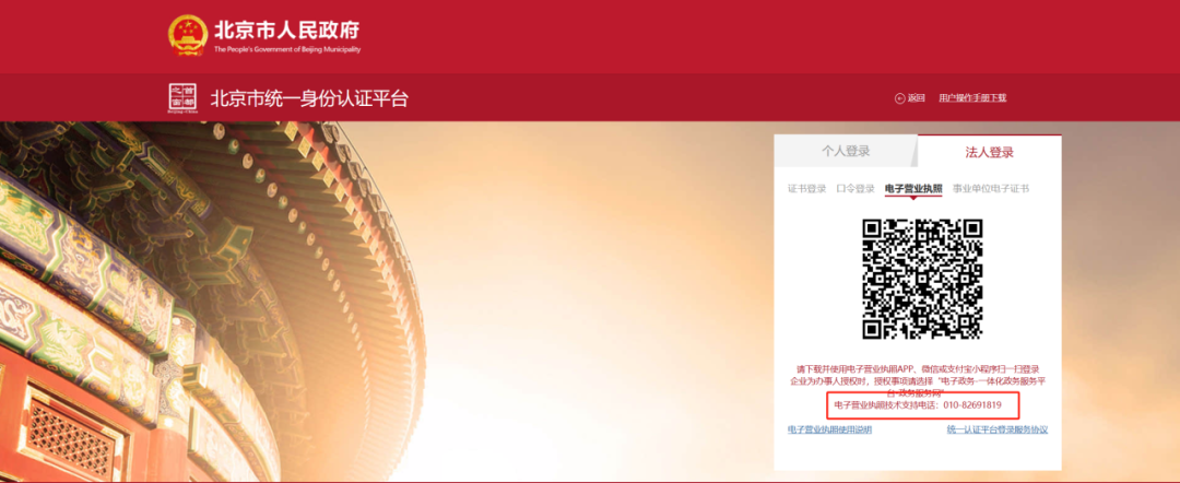 3、点击“法人统一认证登录”系统自动前往“北京市统一身份认证平台”,可根据实际情况选择登录方式,并通过提示完成认证,如遇到登录或注册问题请联系统一身份认证平台技术支持,如图所示:
