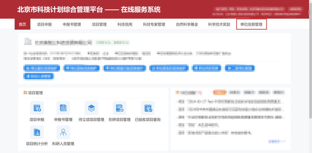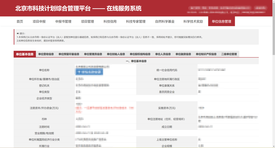 1、认证通过后系统自动登录进入“北京市科技计划综合管理平台 —— 在线服务系统”点击“单位信息管理”栏目直接跳转单位基本信息页面,如图所示: