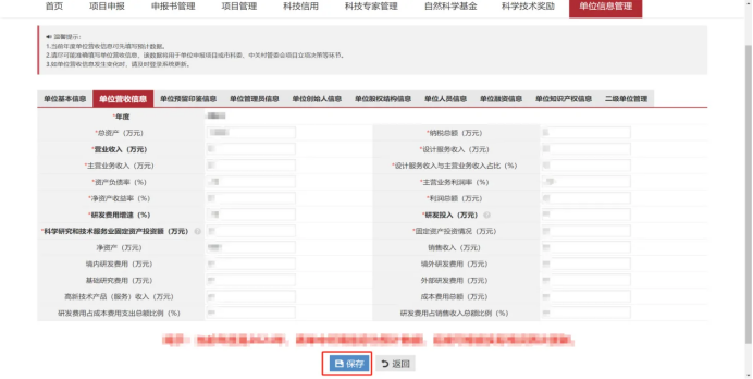3、填写/修改单位营收信息:如存在所查询年度的营收信息,点击右方“修改”,如不存在所查询年度的营收信息,点击下方“新增”按钮,选择年度,修改填写完成后保存即可。