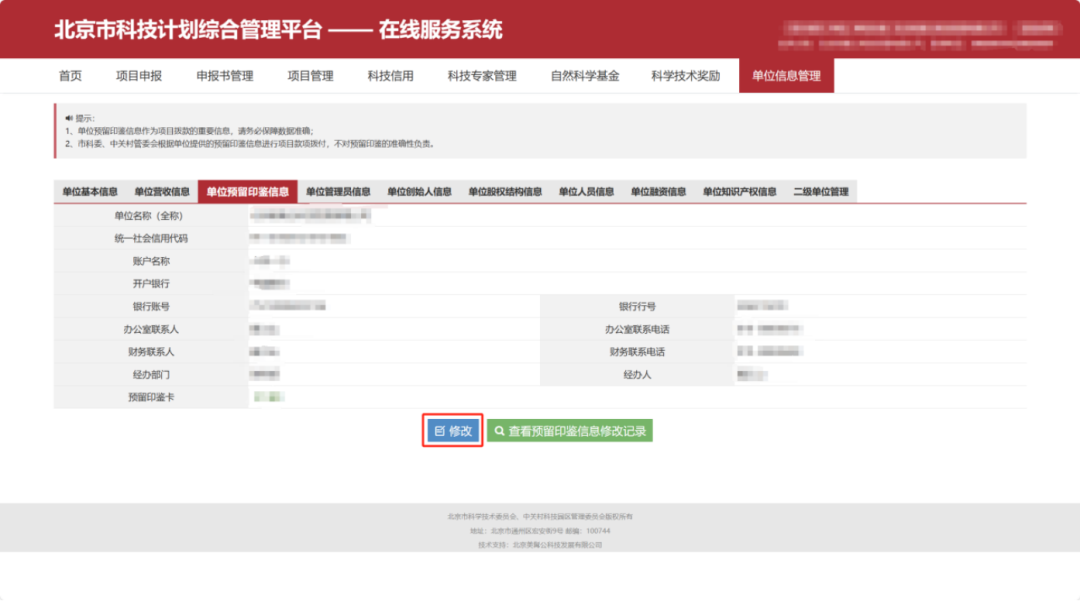 4、填写/修改单位银行预留印鉴信息:点击修改按钮,填写账户名称、开户银行、银行账号等信息。务必确保准确无误。
