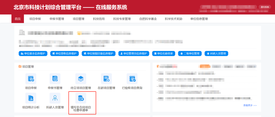 1、在北京市科技计划综合管理平台在线服务系统(https://mis.kw.beijing.gov.cn)中选择首页中的“项目管理”模块中的“填写非合同项目经费申请单”,进入选择界面。