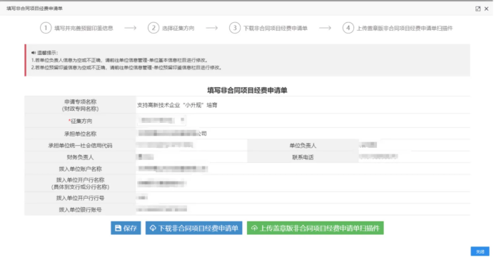 2、信息填写完毕后,点击“保存”、“下载非合同项目经费申请单”,加盖单位公章后,将盖章扫描件上传即可。