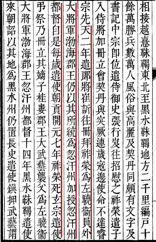 崔忻跋涉数月到达震国后,宣谕大祚荣为“左骁卫大将军、渤海郡王”,以所统为忽汗州,大祚荣领忽汗州都督。大祚荣“自是始去靺鞨号,专称渤海”。
