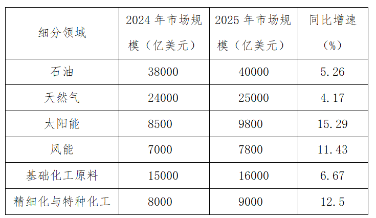 总体而言,2025年能源化工领域呈现分化特征。石油和天然气规模仍占据主导地位,但增速较低。可再生能源的增长速度明显高于传统能源,展现出能源化工领域的绿色化转型趋势。化工领域内部,精细化与特种化工增速相比于基础化工原料明显较高,反映出对高附加值产品需求日益旺盛。整体上,行业结构正朝低碳化、高值化方向演进,可再生能源和精细化工成为新的增长点。