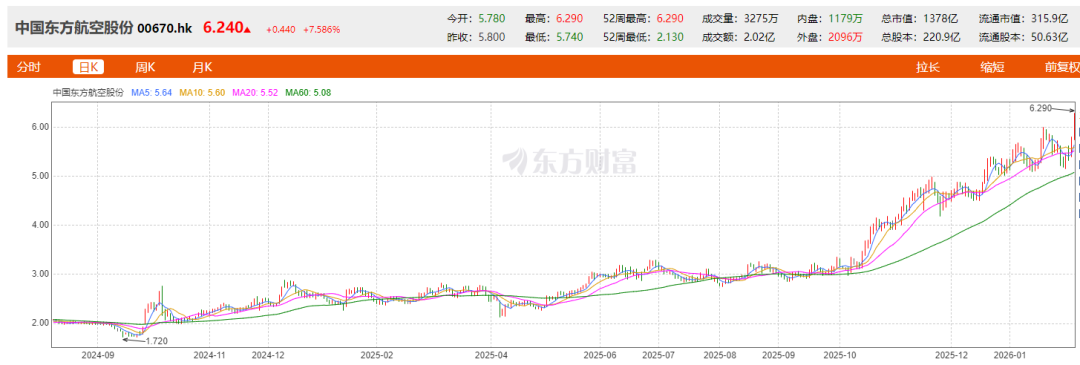 从2024年9月16 日的1.72元,到2026年2月4日的6.19港元,不到一年半的时间内,东航涨幅高达260%。