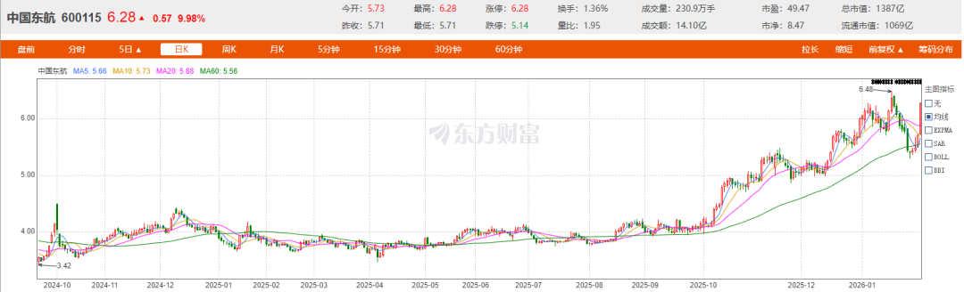 从2024年9月20 日的3.42元,到2026年2月4日的6.28元,不到一年半的时间内,东航涨幅高达84%。
