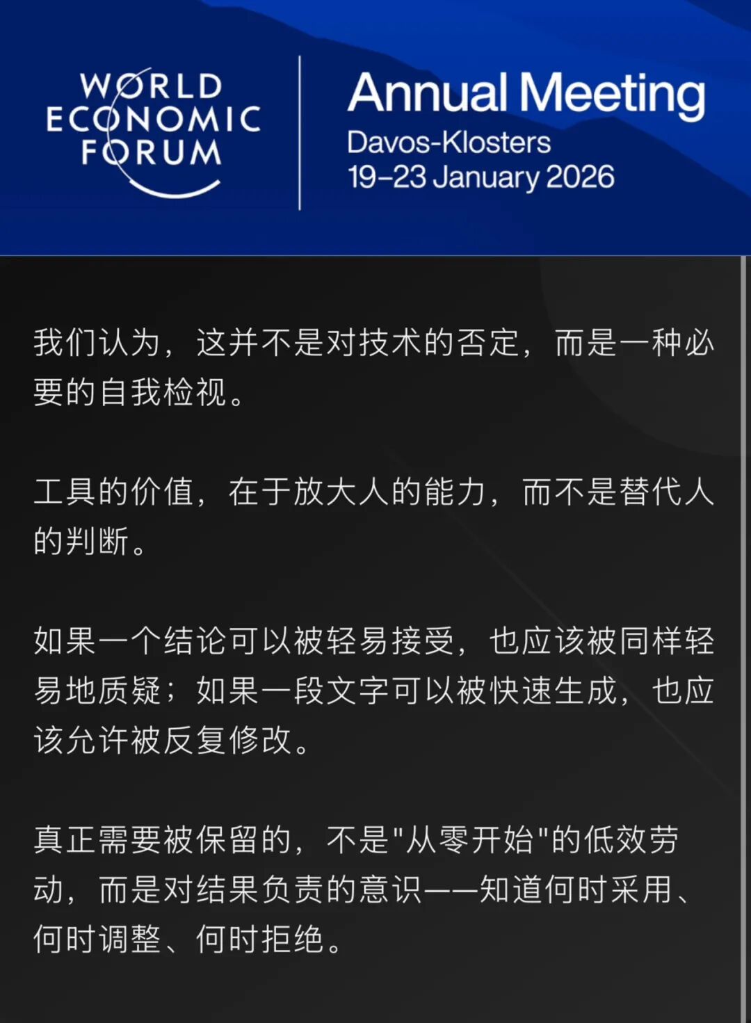 当我习惯把思考交给工具时,我是否还保留了拒绝与修改的能力?(来源:观察整理,基于达沃斯公开讨论)