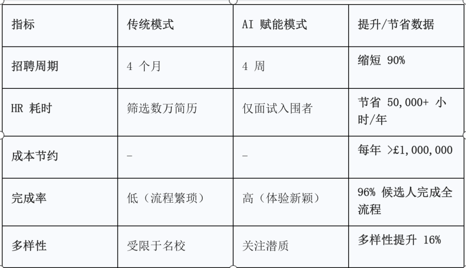 ●价值释放: 仅在英国招聘团队,这一举措就释放了45 个工作日 的产能,让招聘人员从机械的电话初筛中解脱出来,专注于更具战略意义的人才吸引与深度评估。