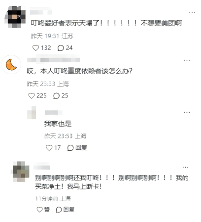 收购消息确认后,有人表示:作为叮咚爱好者,感觉“天塌了”,有人说自己是“叮咚重度依赖症”,还有人觉得叮咚是最后“买菜净土”,强烈要求“还我叮咚”。