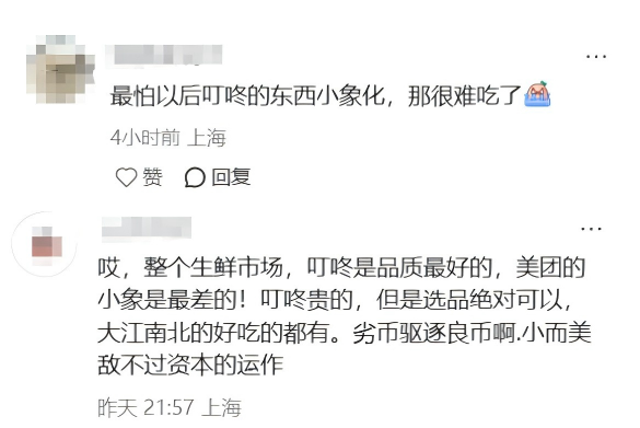网友们认为,小象超市和叮咚有品质差距,害怕叮咚被美团收购后,出现“小象化”的情况。
