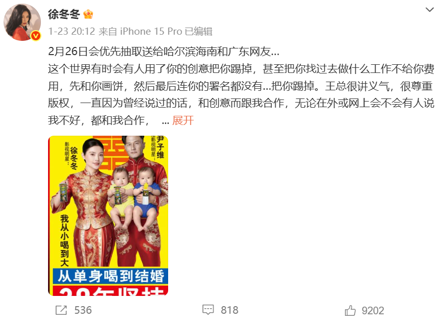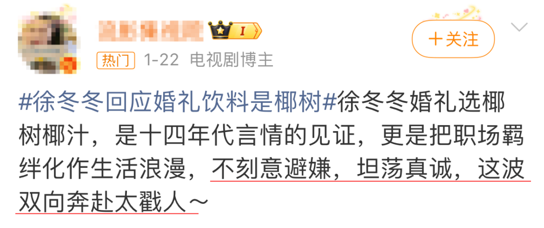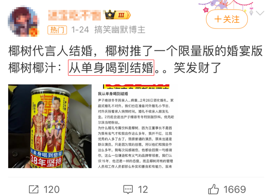 当全网还在围观徐冬冬尹子维的婚讯时,椰树集团直接给自家"长公主"和"新晋姑爷"定制了龙凤胎婚宴限量包装,这让徐冬冬“感动”,她直接在微博上“表白”椰树椰汁的高层领导:椰树的所有领导,管理和人员在他的带领下都很重情义并很有能力……我的宗旨是对我有义气的人我愿意赴汤蹈火。