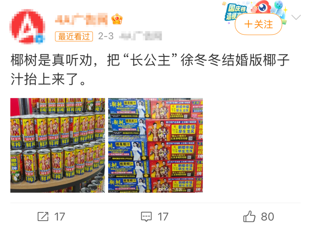 细看后就会发现,椰树的养成剧本,其实是可圈可点的。从徐冬冬还是单身时,椰树就以“娘家人”自居;等到她官宣恋情,品牌立刻化身“娘家人”,带动粉丝一起庆祝;在订婚时,就大手笔的推出订婚包装;如今婚讯一出,直接上线龙凤胎婚宴包装,引发了网友围观,让人直呼“这下早生贵子具象化了”。