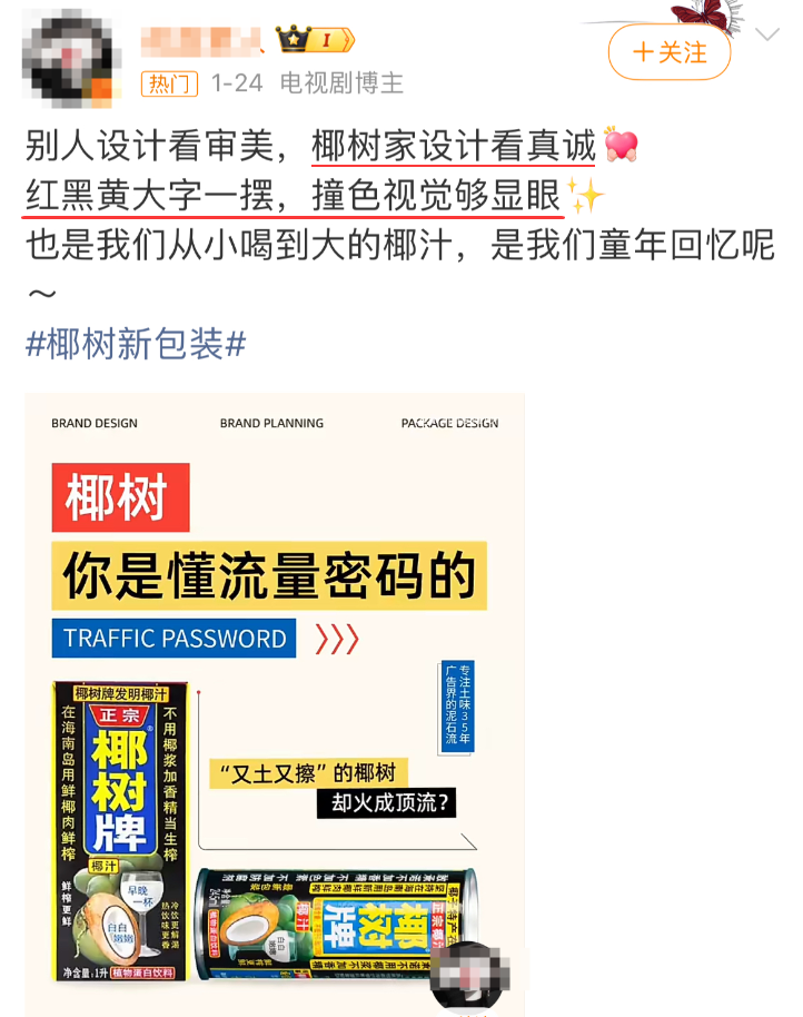 更值得细品的是椰树对“土味”的坚持。在这个追求高级感、极简风的年代,椰树反其道而行之,把“五彩斑斓”变成了品牌记忆点。当其他品牌因为包装改版被骂“失去灵魂”时,椰树包装的“万年不变”反而成了最稳妥的安全牌,因为消费者早已接受甚至爱上了这个“土得真实”的品牌形象。