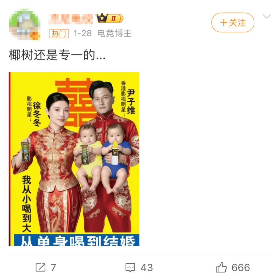 更绝的是,椰树对时间线的把控。当网友发现品牌早在两人订婚时就已开始铺垫,连“女婿”尹子维也多次与“妻子”一起营业力挺椰汁的时候,才恍然大悟:原来这15年不是一般的代言合作,更像是根据代言人人生重要时刻而策划的“品牌赘婿养成记”,当然这也可能演变成品牌的一个新剧本。