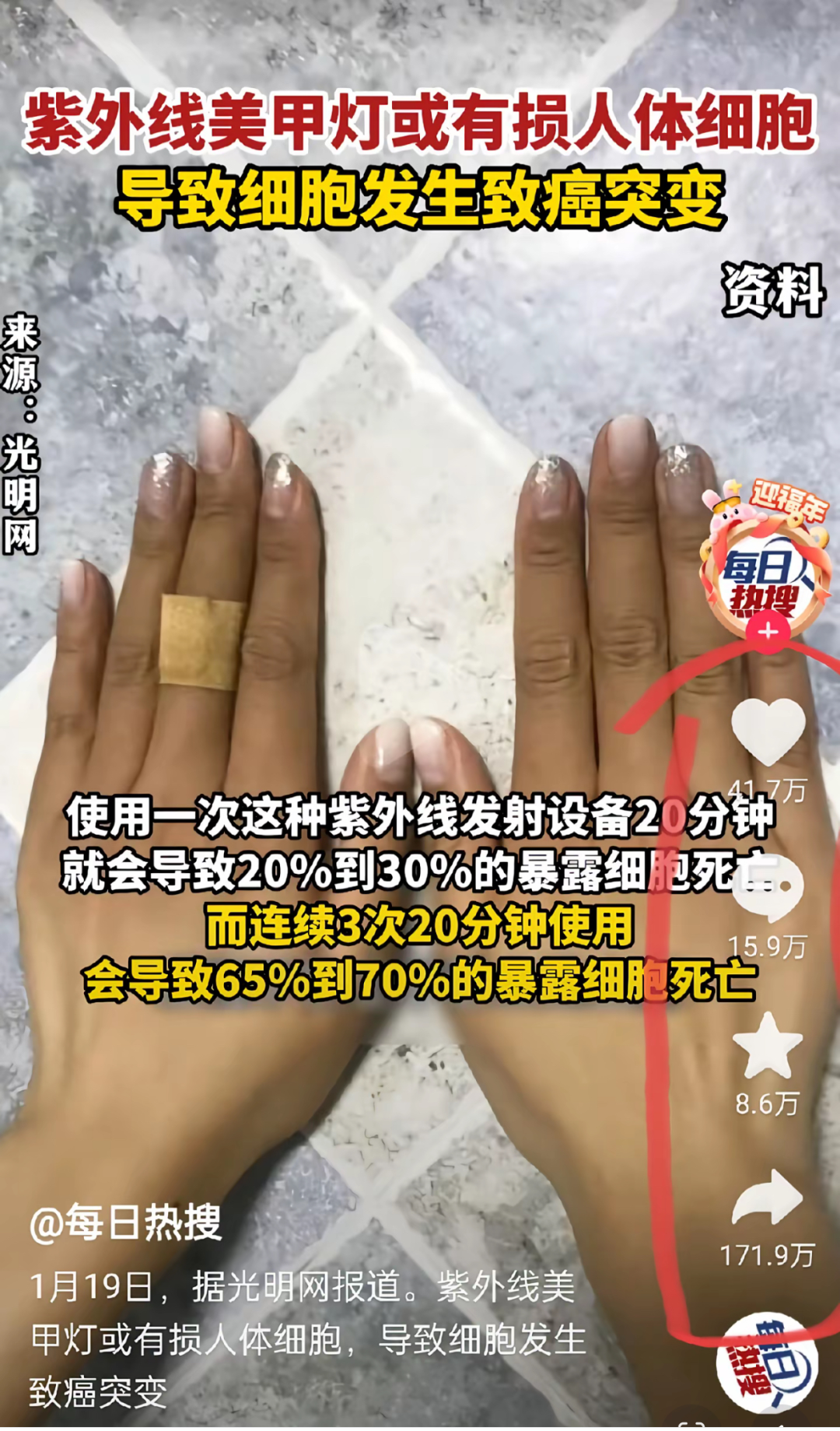 而更可怕的是,做美甲使用的紫外线灯,对人体细胞的伤害也相当大。