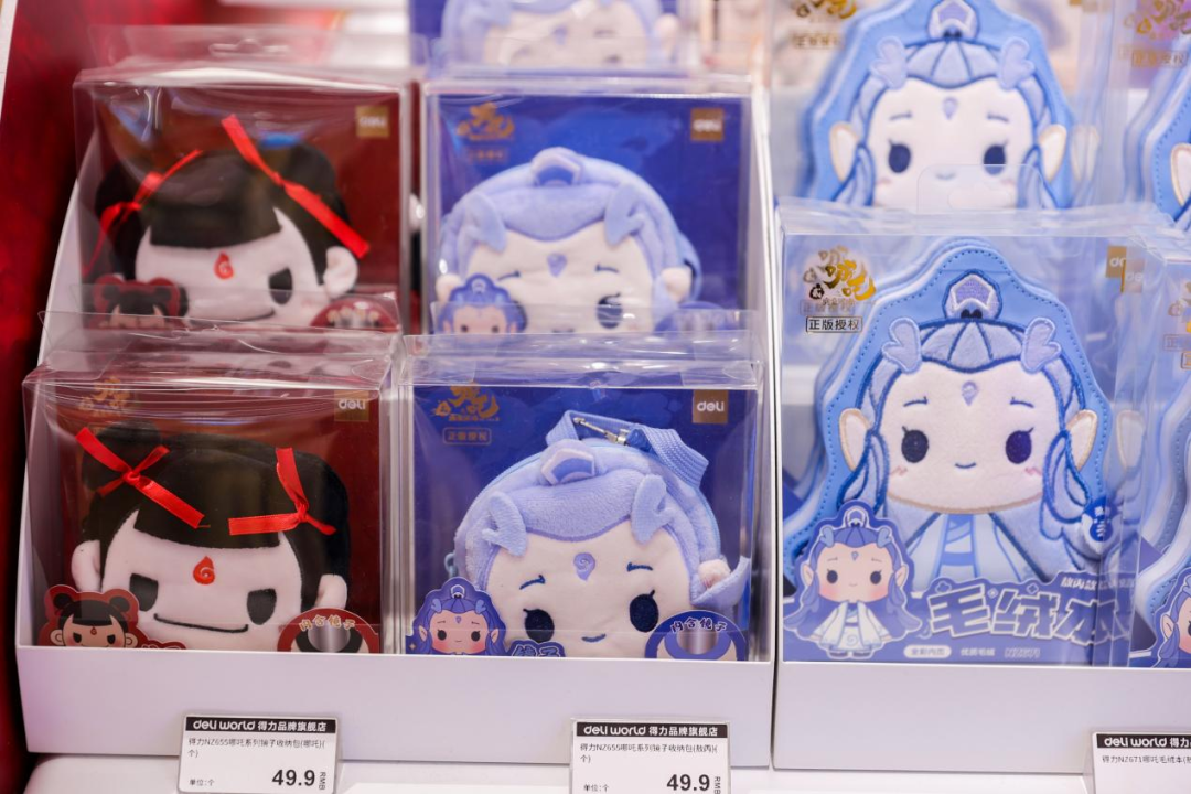 跟国民级动画电影《哪吒之魔童闹海》联名推出的哪吒文具礼盒套装、立体橡皮指环、mini零钱包等制品,其中混天绫配色的中性笔笔锋凌厉,毛绒笔袋上的哪吒眉眼灵动,仿佛要跳出文具直奔新春庙会,受到全年龄段的喜爱。