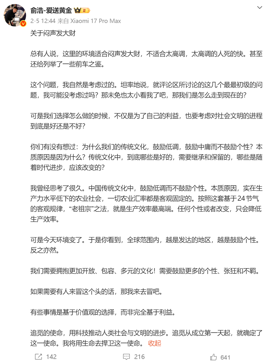 百度百科还写道,2026年2月5日,俞浩发文称,总有人说,这里的环境适合闷声发大财,不适合太高调,太高调的人死的快。这些问题他都考虑过。他认为,中国传统文化中,鼓励低调而不鼓励个性,本质原因是生产力水平低下的农业社会,一切农业规律都是客观固定的。