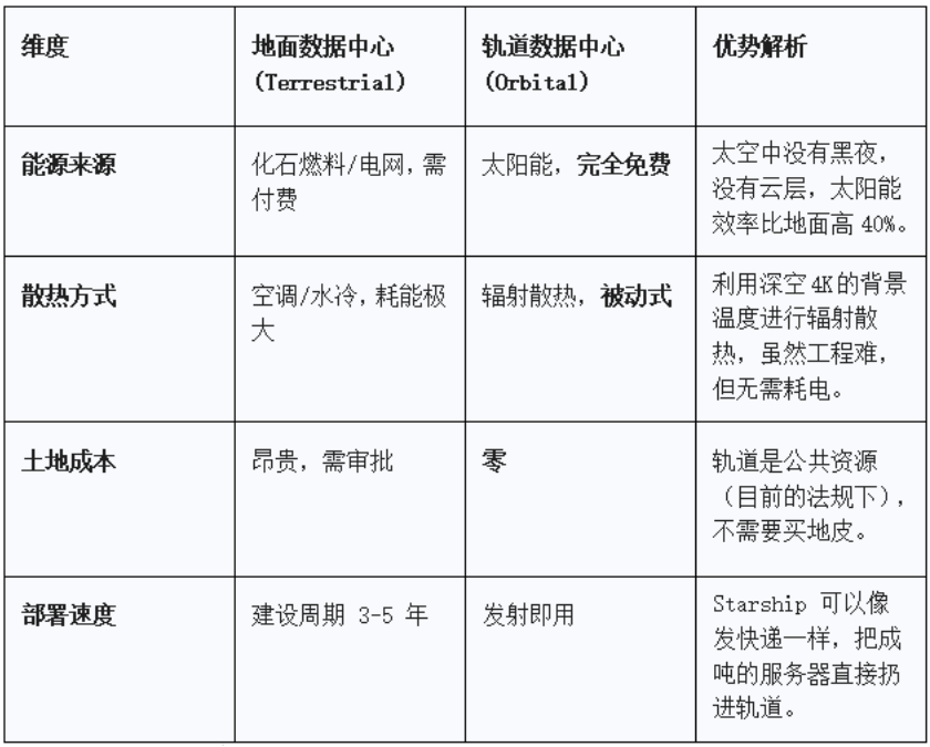 马斯克的解法是典型的“第一性原理”思维:既然地球上电费贵、散热难、破事多,那我们就去太空!。