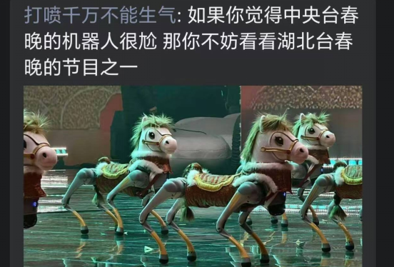 湖北卫视的机器人与歌手海来阿木合作钢琴演奏,12只穿小马装的机器狗与12台机器人共同完成开场舞。面对机器人的“全面入侵”,网友们的评价呈现出明显的两极分化。