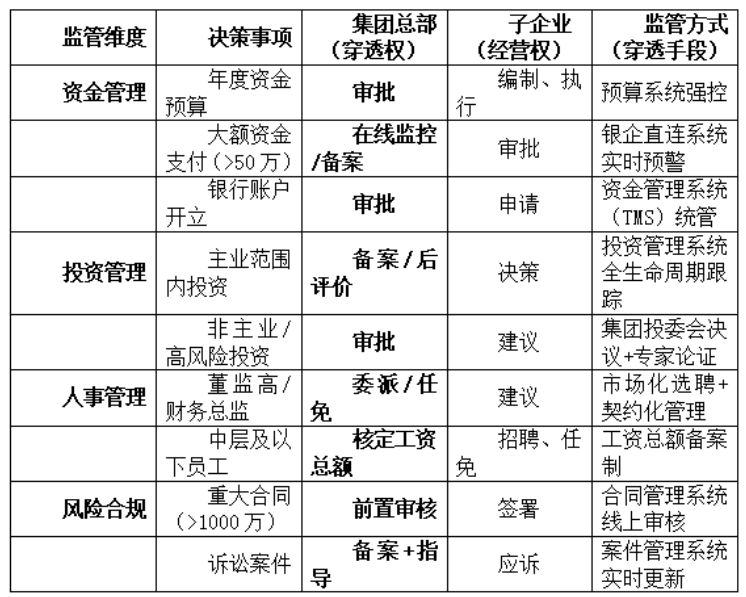 * 穿透手段:通过条线垂直管理,对业务进行全过程管控。例如,财务部通过“资金支付系统”对每一笔大额资金进行强制审核;法务部通过“合同管理系统”对每一份合同进行法律审核。