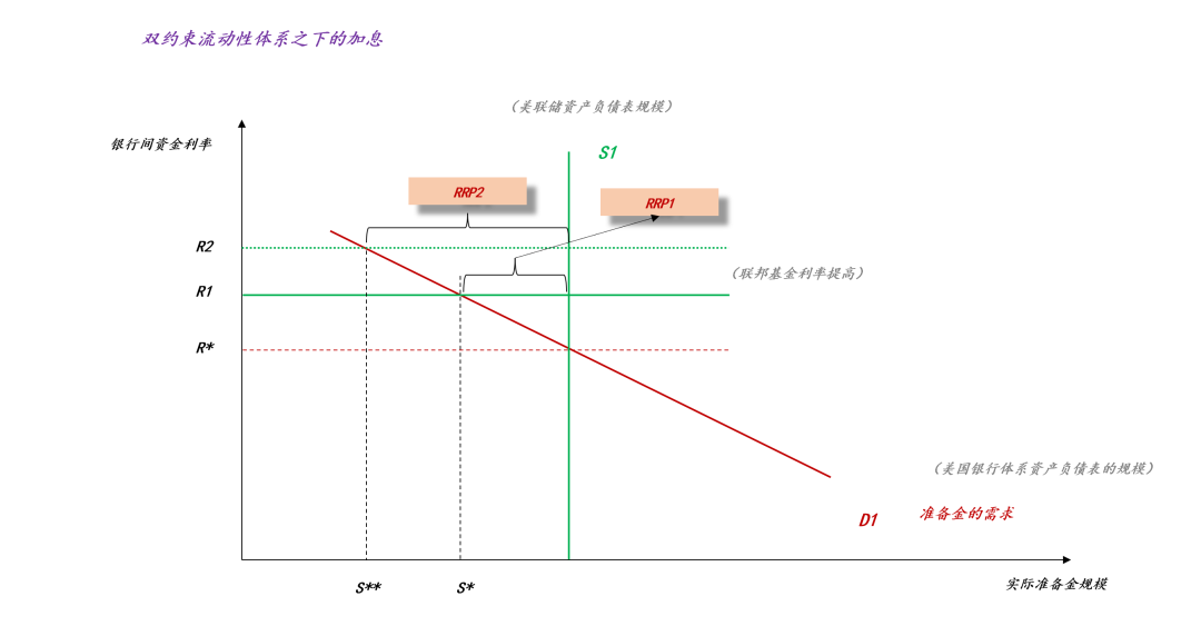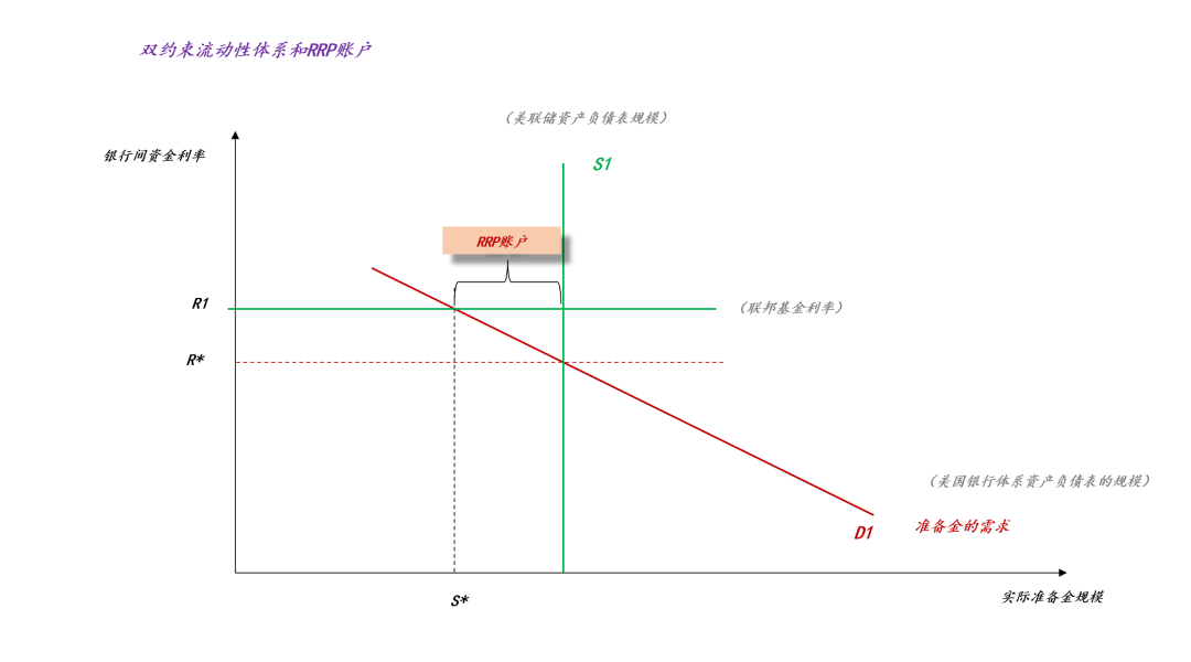 然而,在准备金的供需曲线之中,只有两个自由度,准备金规模S和银行间资金利率R。所以,这两个约束之间必然出现冲突,需要一个额外的变量来平衡这对冲突,于是,RRP账户应运而生。