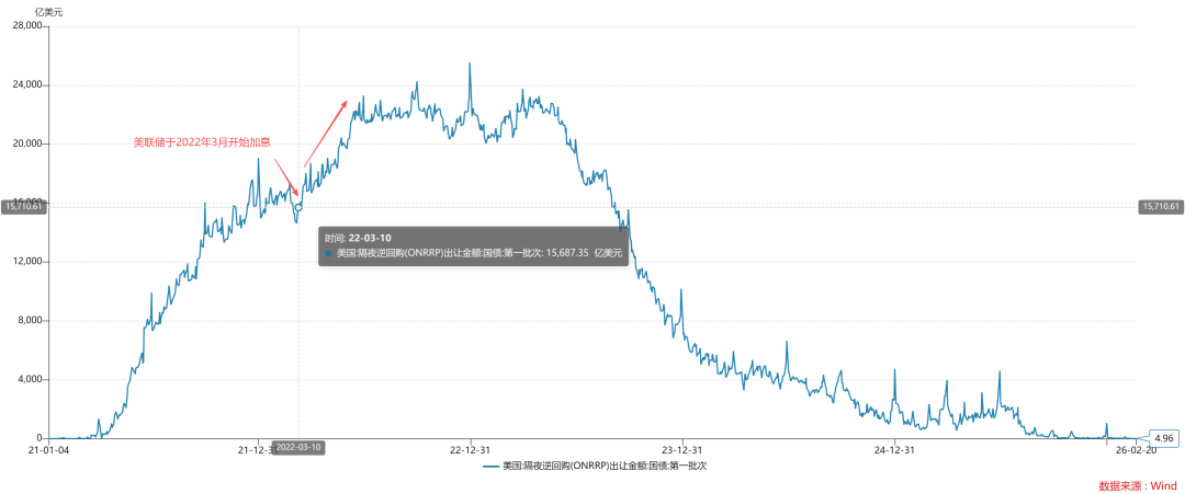 在单约束体系下,数量约束S和价格约束R几乎是等价的,缩减央行资产负债表S等于加息政策利率R:如上图所示,美联储资产负债表从S1缩减至S2,于是,联邦基金利率从R1提高到R2,也就是说,缩表和加息是可以混用的。然而,一旦我们进入双约束体系下,单约束体系之下的直觉就靠不住了。如上图所示,在双约束体系下,我们让联邦基金利率从R1提高到R2,我们会发现一个神奇的现象:RRP账户的余额是扩大的,从RRP1扩大到RRP2。也就是说,提高政策利率R会导致双约束的限制变小,本币流动性变得充裕。这跟单约束体系下的结论截然相反。如上图所示,美联储于2022年3月开始加息,加息之后RRP账户的余额继续攀升,并于2022年6月到达2.3万亿,还在这个平台保持了一年左右。要知道在这个过程中,美联储已经开启了缩表,加之实体经济对准备金的需求持续增加,如果“加息等于收紧”,那么,RRP账户的余额不可能持续增加,并在高位保持一年。所以,事实的真相是:在双约束体系下,加息是放松约束,降息才是收紧约束。理解了这个关键的bug,我们就能明白鲍威尔有多么鸽了。