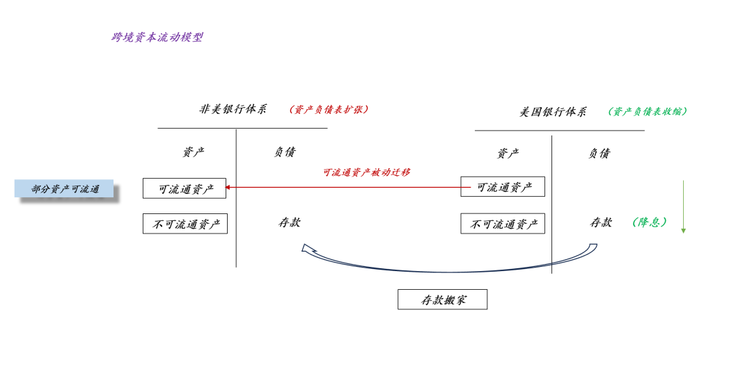 上述的讨论告诉我们,单约束体系和双约束体系完全不同,之所以很多投资者盼望“美联储降息”,是因为他们天真地把美国流动性控制体系简化为单约束体系。下面我们可以做一个思想实验——如何在双约束体系下“降息+缩表”:如上图所示,在双约束体系下,如果RRP账户归零,美联储还想要把联邦基金利率从R1降低到R2,这时候我们会发现,准备金的需求是大于供给的,这会倒逼实体经济去杠杆,以降低对准备金的需求。于是,准备金的需求曲线D从D1收缩至D2。也就是说,在双约束体系下,降息和实体经济的缩表是等价的。如上图所示,我们只要把美国银行体系和非美银行体系当成两家银行即可,当美国银行体系降息时,存款会从美国搬家到非美,于是,美国银行体系缩表,非美银行体系扩表。更进一步,我们不但要求联邦基金利率从R1降低到R2,还要求美联储的资产负债表从S1缩减至S2,于是,最严厉的紧缩诞生了,准备金的需求曲线不是从D1收缩至D2,而是从D1大幅收缩至D3。这段推理再次提醒我们——“在双约束体系下,数量约束和价格约束是两回事”,降息会导致实体经济挨一刀,美联储缩表会导致实体经济再挨一刀。推理到这里,我们就能明白,为啥市场那么害怕“沃什的降息缩表”了。这几乎是双约束体系下最严厉的紧缩。