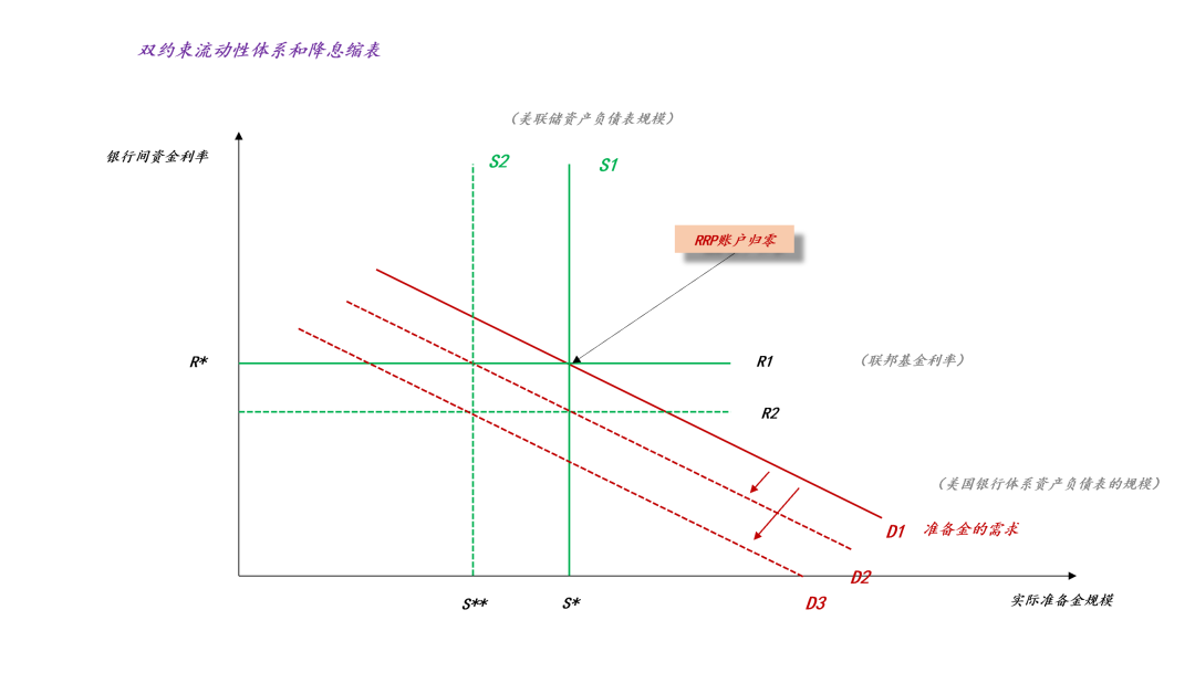 这是一个十分巧妙的制度设计,给定准备金的需求曲线D不变,数量约束S和价格约束R,被综合为RRP的余额(ps:在这里需要注意的是,美国的法定准备金率为零,所以,数量方面的紧约束为美联储的资产负债表规模)。也就是说,当RRP的余额大,双约束的限制大;相反,当RRP的余额小,双约束的限制小。