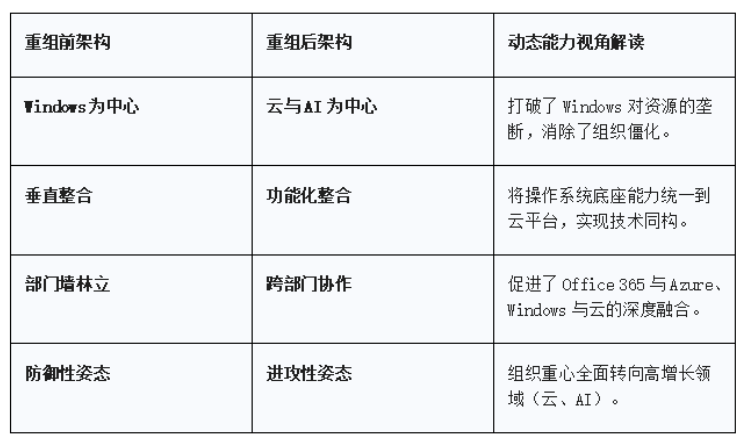 ●通过重组,微软重塑了组织基因,建立了适应快速变化的敏捷文化和架构(成长型思维、拆分Windows)。