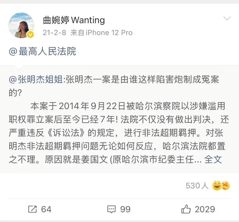 更离谱的是,检查机关铁一样的贪污证明摆在面前,她却一直坚称张明杰无罪,多次在微博上蹦跶。