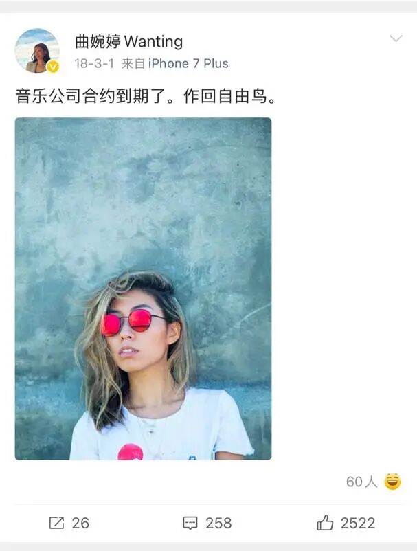 但曲婉婷事业也越混越差了,和唱片公司解约,多年没有新作品。
