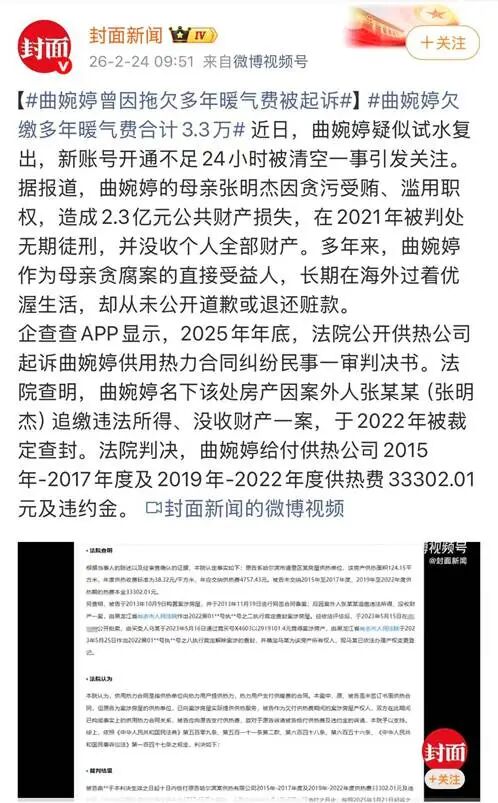 就在不久前,法院还公开她被供热公司起诉的判决书,拖欠暖气费3.3万。