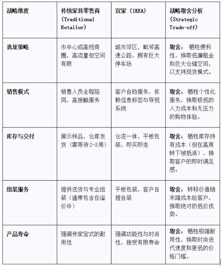 为了更清晰地展示这一战略取舍,我们可以通过下表对比宜家与传统家具零售商的差异: