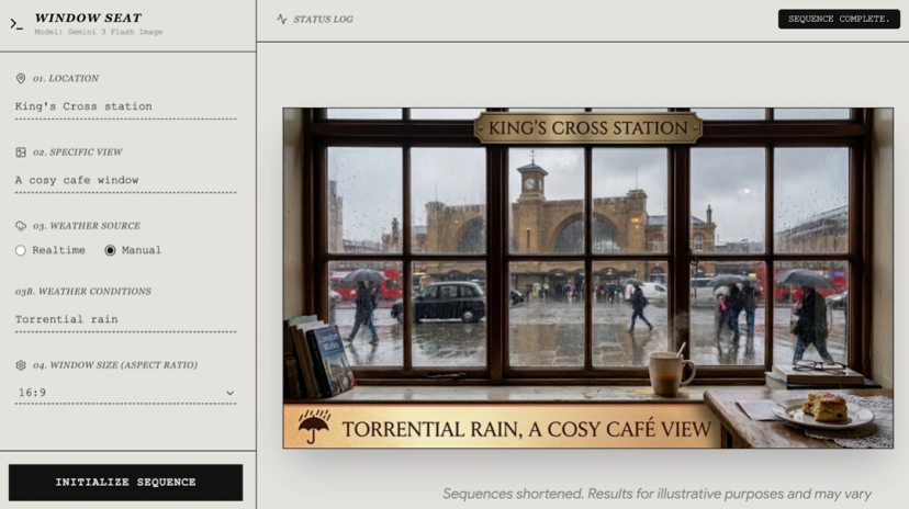 在谷歌的“Window Seat”演示中。它能够根据用户指定的任何地点和当前的实时天气数据,生成该地点窗外的逼真景观。