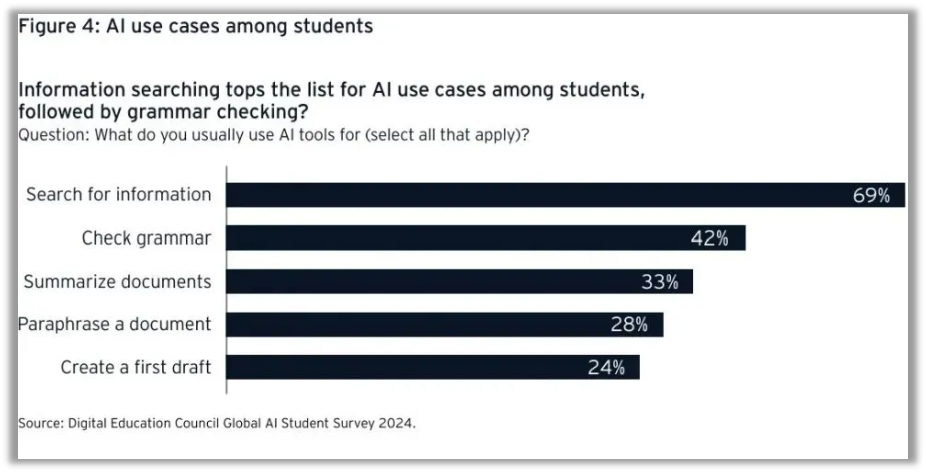 一项全球调查显示,86%的大学生会使用AI工具,“其中24%的学生每天都在使用,最常见的是用于搜索信息、检查语法和撰写初稿。”